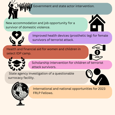 2023 Report Women! FRLP climaxed in September with the induction of twelve female journalists as Fellows. These Fellows implemented investigative stories and leadership projects on issues affecting women. It brought the number of Fellows to 86 since inception.