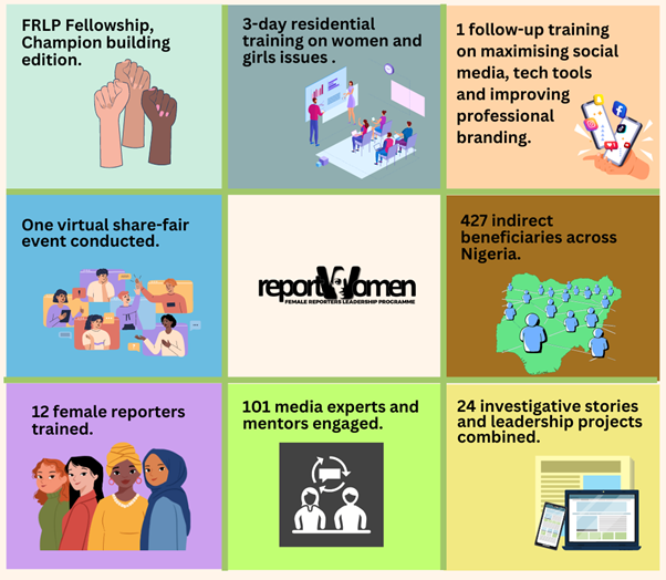Supported by the Bill and Melinda Gates Foundation, the Report Women! News and Newsroom Engagement Champions edition of the Female Reporters Leadership Programme (FRLP) fellowship trained, mentored, and inducted 12 Fellows to address issues affecting women through stories and leadership projects.