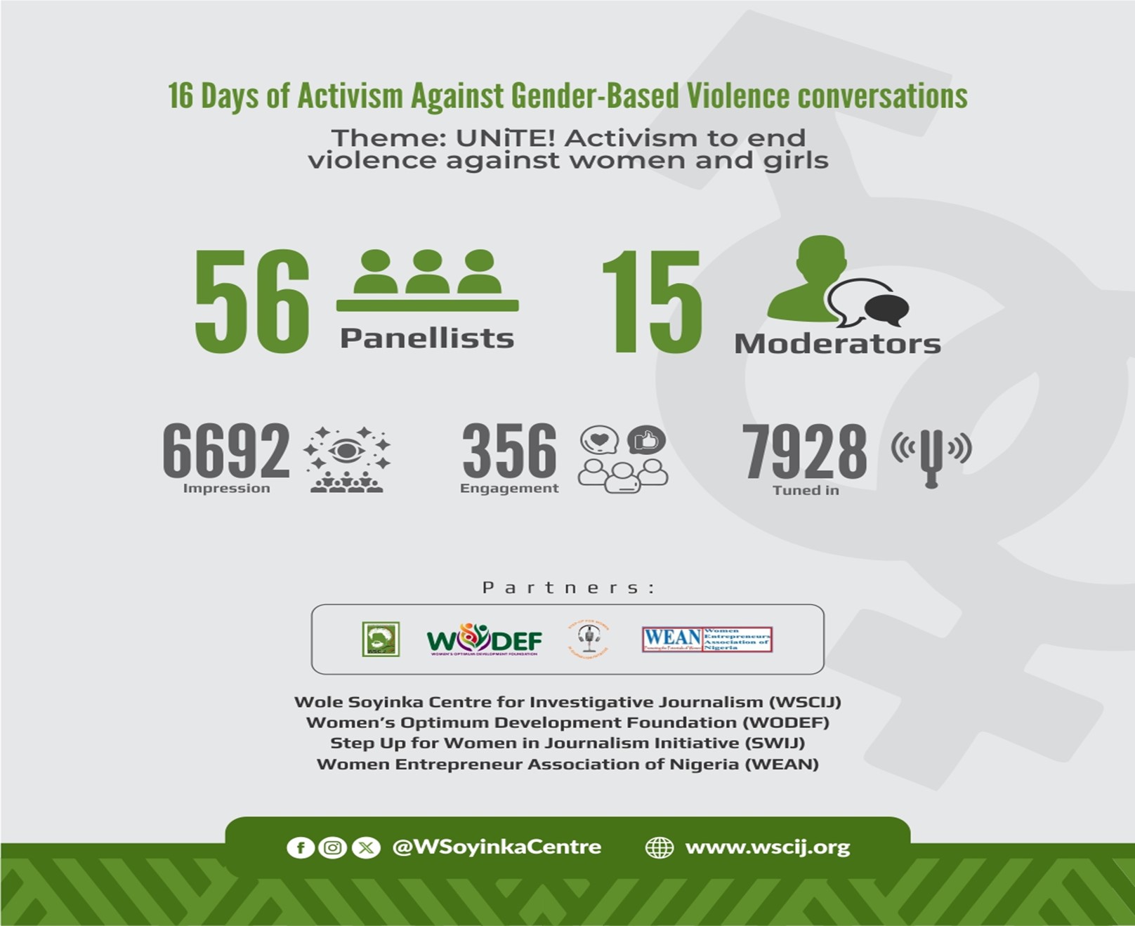 The 2023 edition of the 16 days of activism against Gender-Based Violence (GBV) was celebrated in style as WSCIJ collaborated with Women’s Optimum Development Foundation (WODEF) to host conversations for 16 days on X Spaces from Saturday, 25 November to Sunday, 10 December 2023, at 4pm daily. The 16-day conversation featured 15 moderators 56 speakers across various sectors to raise awareness against child marriage, advocate for changes in legal frameworks, gender inclusion in the war against GBV, affirmative actions, improved involvement of the media to combat gender-based violence and other issues with Women Entrepreneur Association of Nigeria (WEAN) and Step Up for Women in Journalism Initiative (SWIJ) as collaborators.