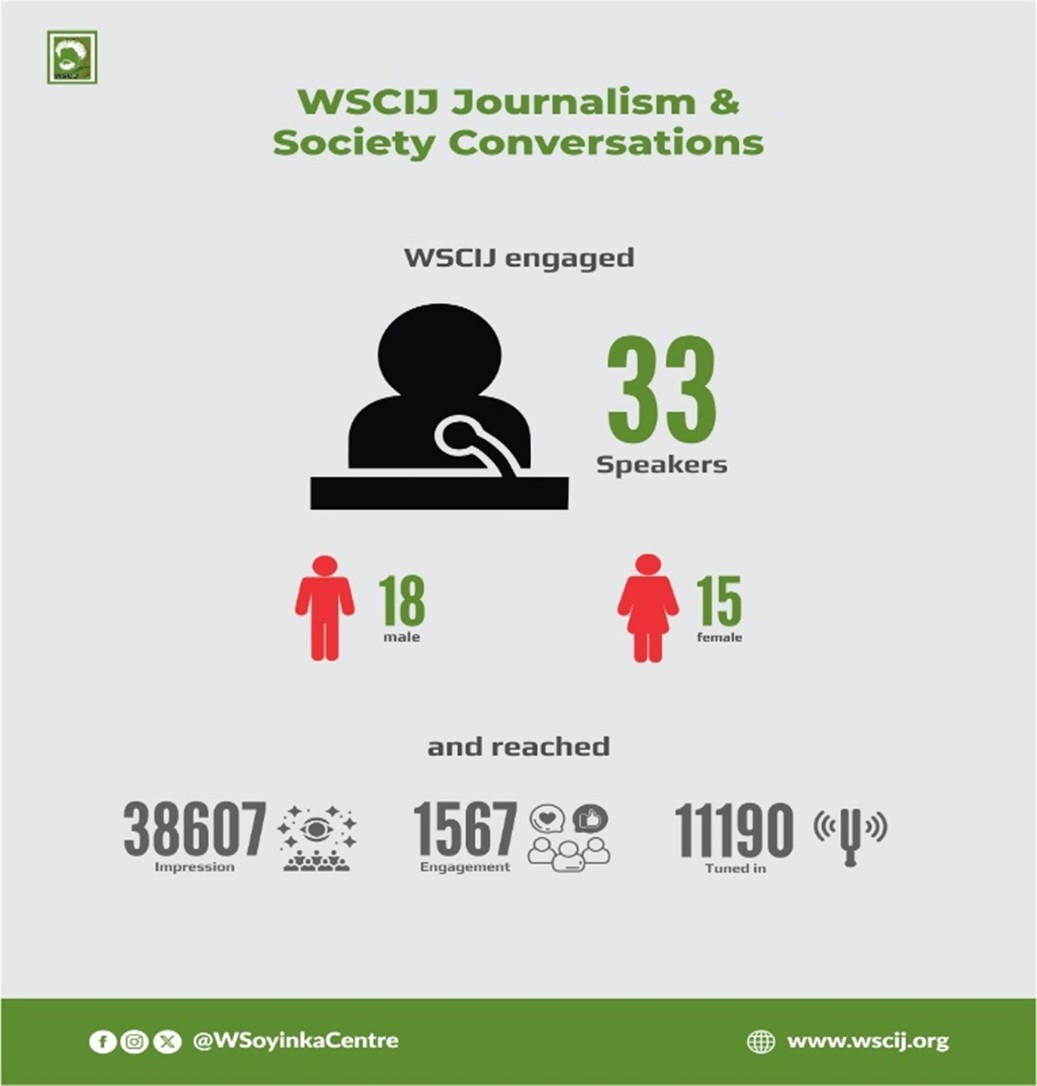 Launched in 2023, we held six WSCIJ Journalism & Society Conversations. We emphasised journalists’ role in Nigeria’s democratic struggle, and addressed issues like gender inequality and media independence. 38607 impressions represent the number of times the conversations were viewed on X (formerly Twitter), while 1567 engagements were the reposts, replies, follows, clicks, and likes. Furthermore, a total of 11,190 individuals either participated live or listened after the conversation had ended.