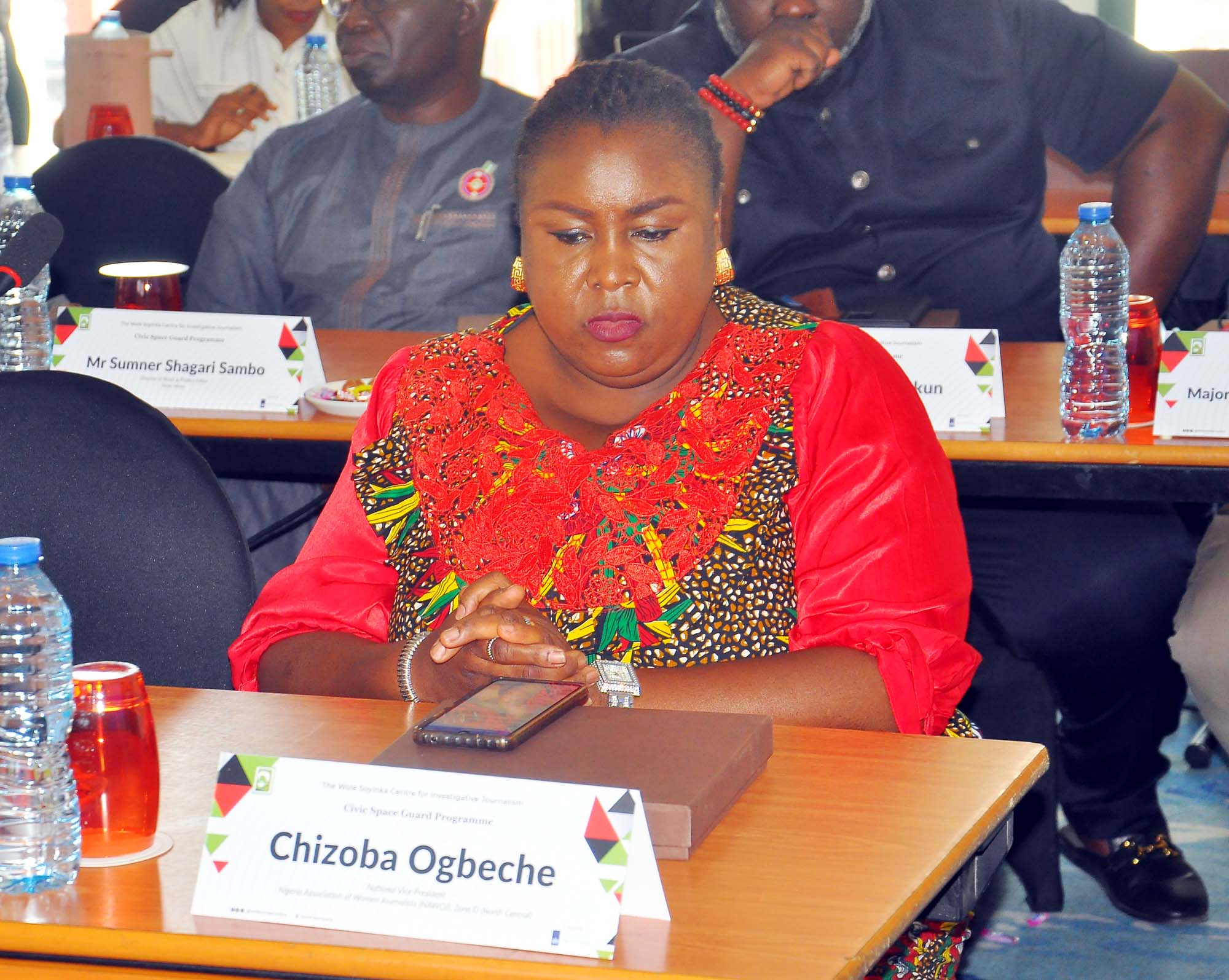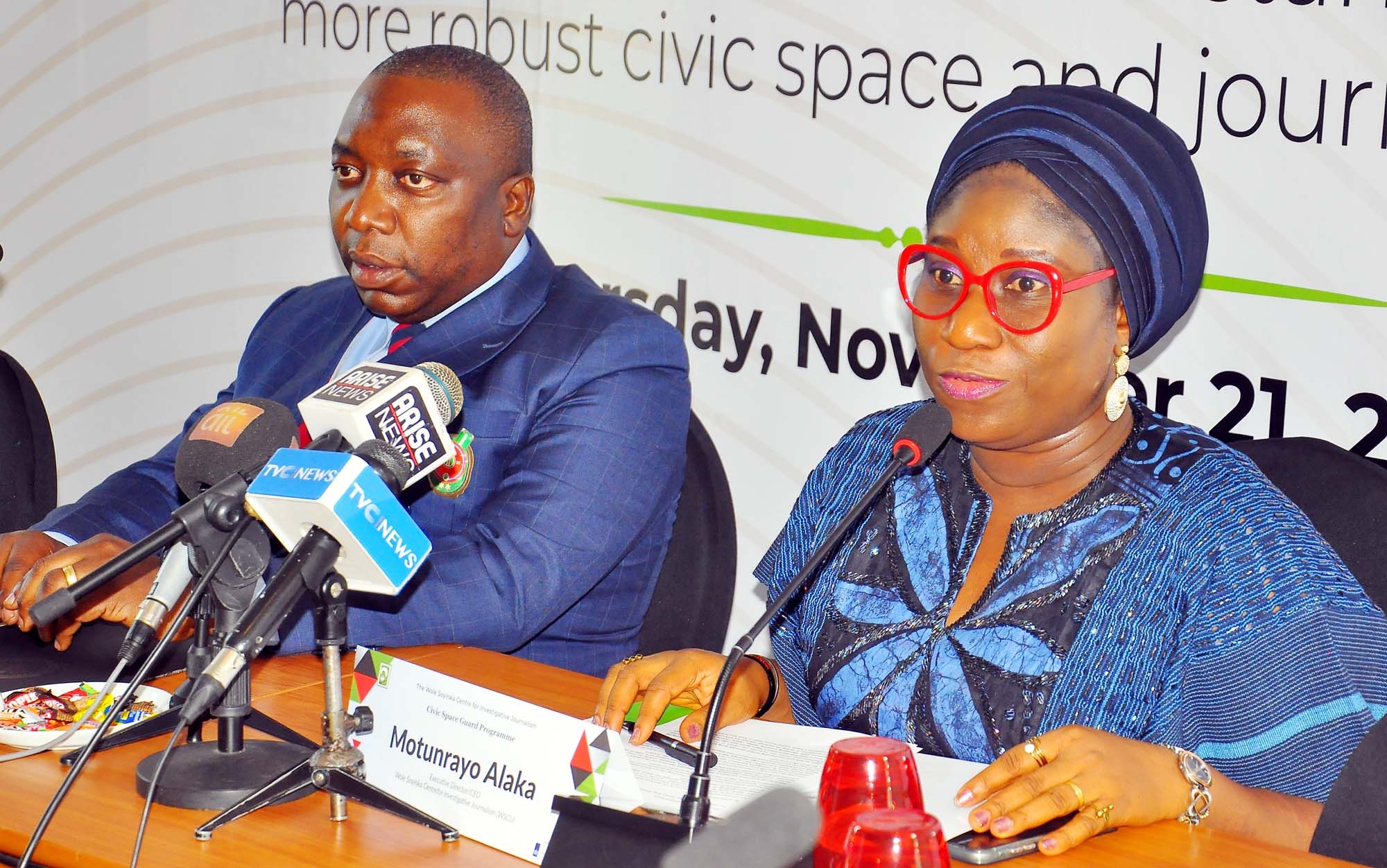 L-R: National Vice President, Nigeria Association of Women Journalists (NAWOJ), Zone D, (North Central), Mrs. Chizoba Ogbeche, during the Wole Soyinka Centre for Investitive Journalism, Civic Space Guard Project, High-Level Stakeholders Meeting on Safety of Journalists and Robust Civic Space, held in Abuja