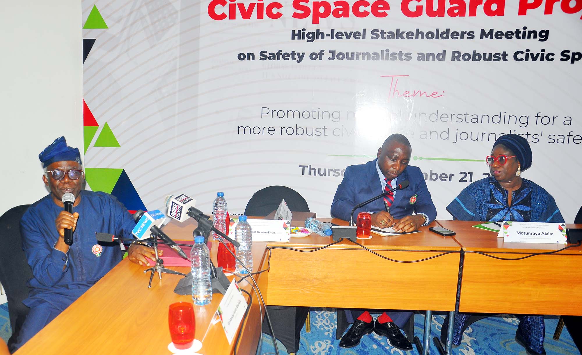Femi Falana, Senior Advocate of Nigeria; Representative of the National Security Adviser (NSA), Director of Communications office of NSA, Major General Samad Akesode, and Executive Director/CEO, Wole Soyinka Centre for Investitive Journalism (WSCIJ), Motunrayo Alaka during the Wole Soyinka Centre for Investitive Journalism, Civic Space Guard Project, High-Level Stakeholders Meeting on Safety of Journalists and Robust Civic Space, held in Abuja