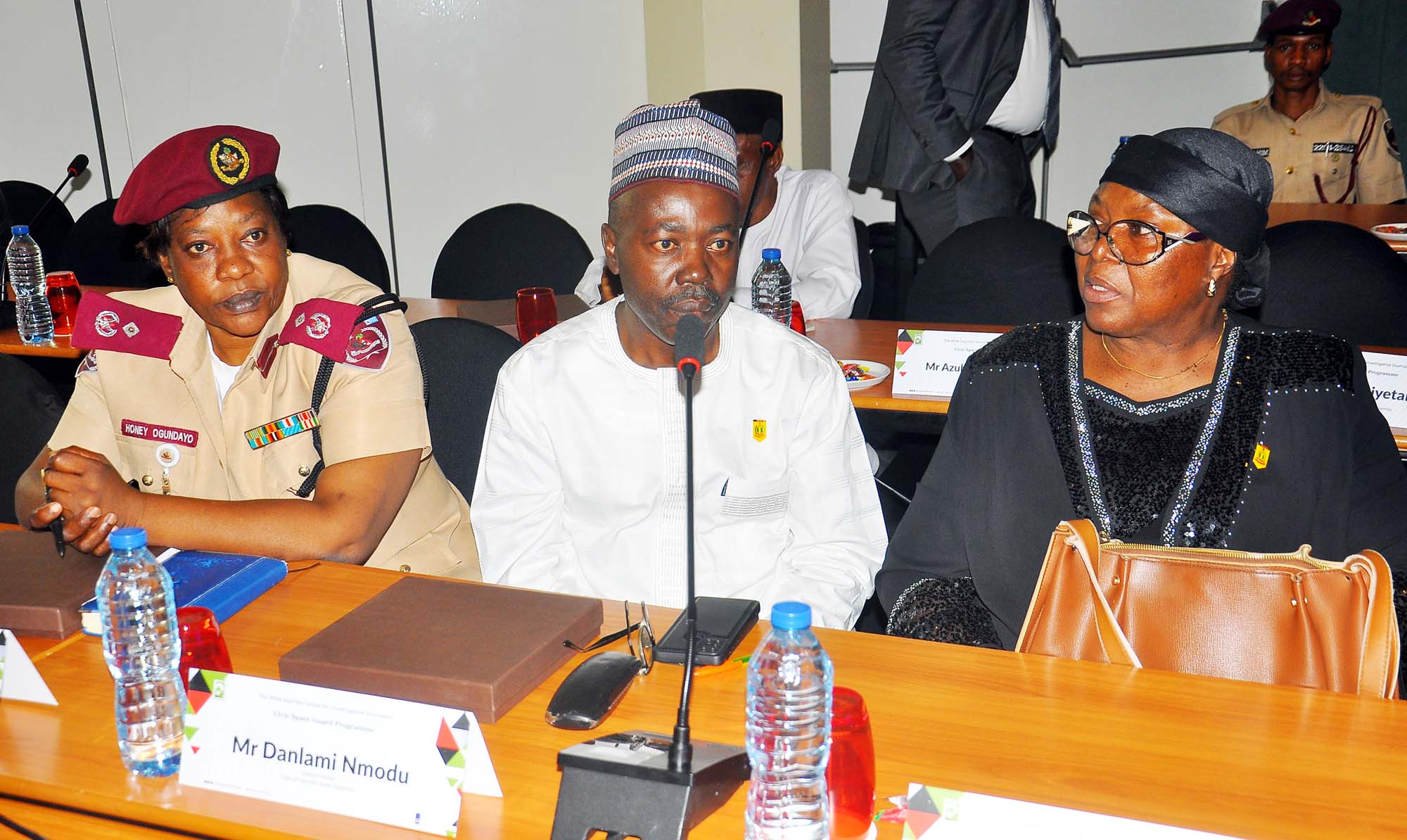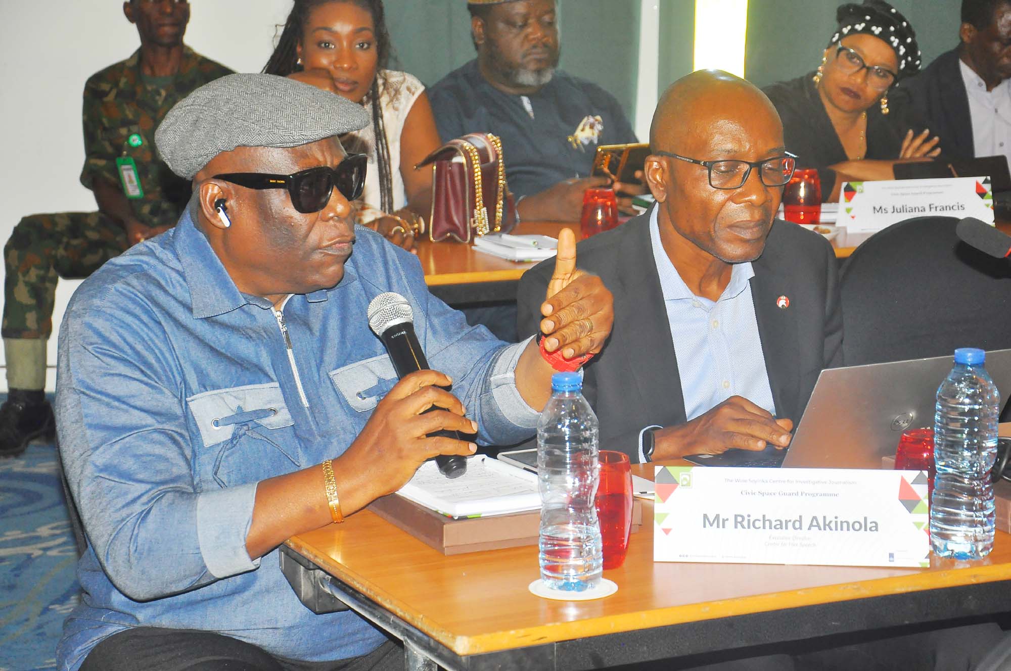 L-R: Representative of the National Security Adviser (NSA), Director of Communications office of NSA, Major General Samad Akesode, during the Wole Soyinka Centre for Investitive Journalism, Civic Space Guard Project, High-Level Stakeholders Meeting on Safety of Journalists and Robust Civic Space, held in Abuja