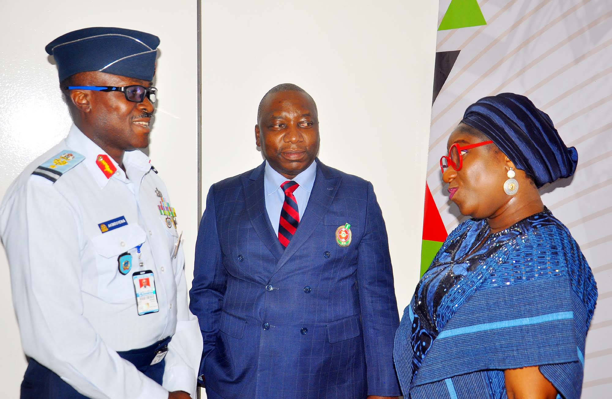 L-R: Representative of the National Security Adviser (NSA), Director of Communications office of NSA, Major General Samad Akesode; Representative of the Chief of the Air Staff, Director of Public Relations and Information, Air Commodore Olusola Akinboyewa, and Executive Director/CEO, Wole Soyinka Centre for Investitive Journalism (WSCIJ), Motunrayo Alaka, during the Wole Soyinka Centre for Investitive Journalism, Civic Space Guard Project, High-Level Stakeholders Meeting on Safety of Journalists and Robust Civic Space, held in Abuja