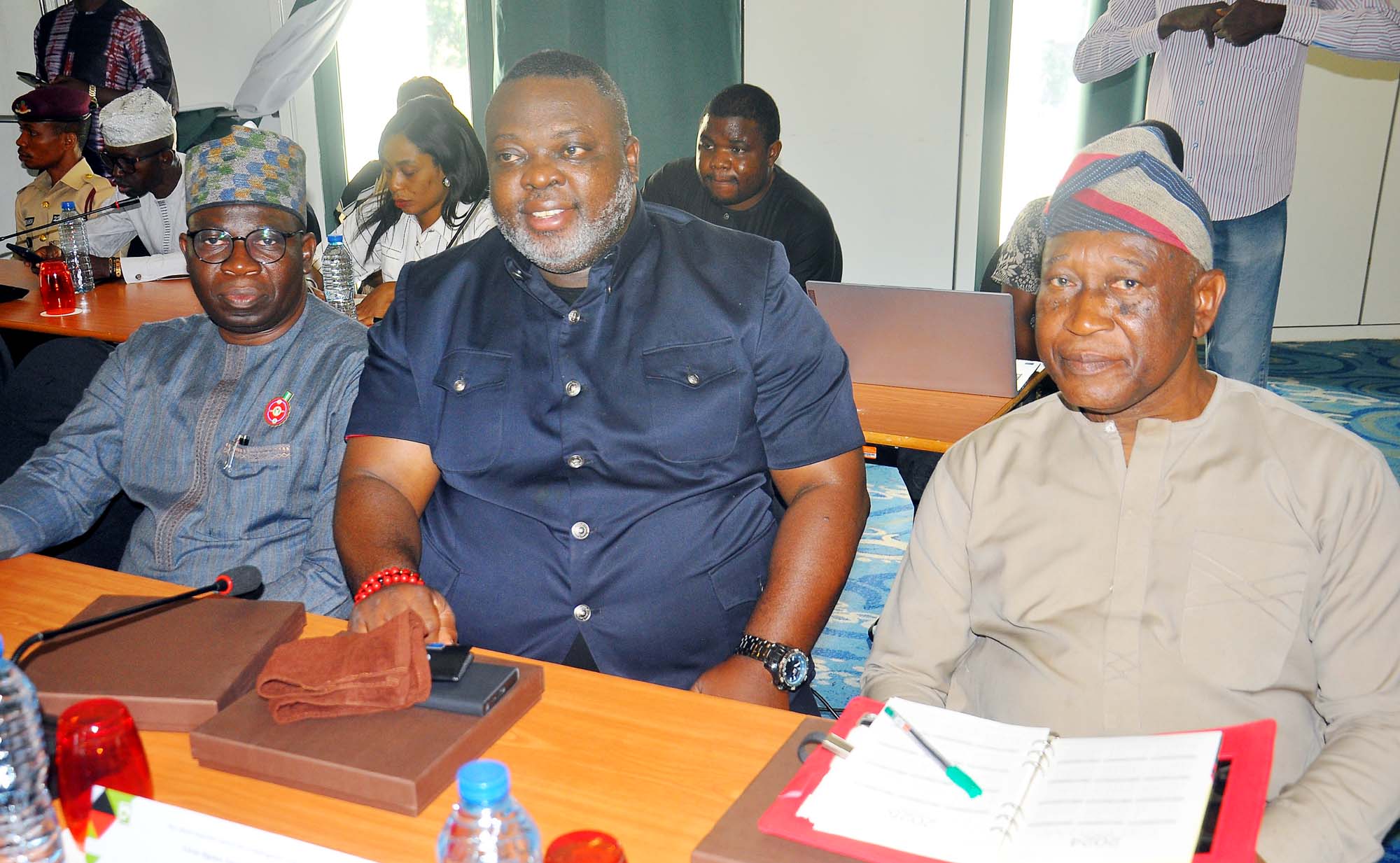 L-R: Chairman Centre for Crisis Communication Major General Chris Olukolade; Bureau Chief TVC Abuja Mr Ayodele Ozugbakun, and Director of News and Politics Editor Arise News, Mr. Sumner Shagari Sambo, during the Wole Soyinka Centre for Investitive Journalism, Civic Space Guard Project, High-Level Stakeholders Meeting on Safety of Journalists and Robust Civic Space, held in Abuja