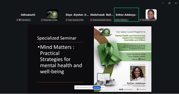 To promote and protect the mental health of journalists, the Wole Soyinka Centre for Investigative Journalism (WSCIJ) convened its mental health training under the Civic Space Guard project, to strengthen the resilience of journalists while advancing conversations around safety, wellbeing, and the sustainability of investigative reporting.