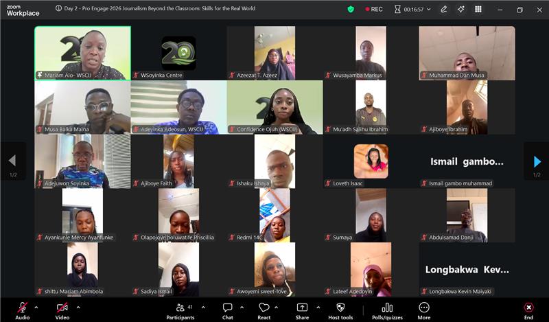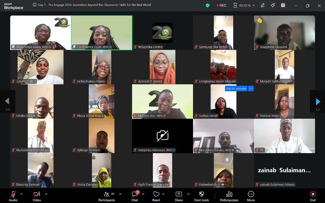 From ethics to storytelling, pitching and newsroom decision-making, over 62 young journalists from universities across Northern Nigeria participated in a two-day virtual Pro-Engage training organised by the Wole Soyinka Centre for Investigative Journalism (WSCIJ), held on Wednesday 22 and Thursday 23 April 2026. The training, themed ‘Beyond the Classroom: Investigative Skills for Emerging Journalists’, was designed to strengthen journalistic practice and deepen understanding of responsible journalism.