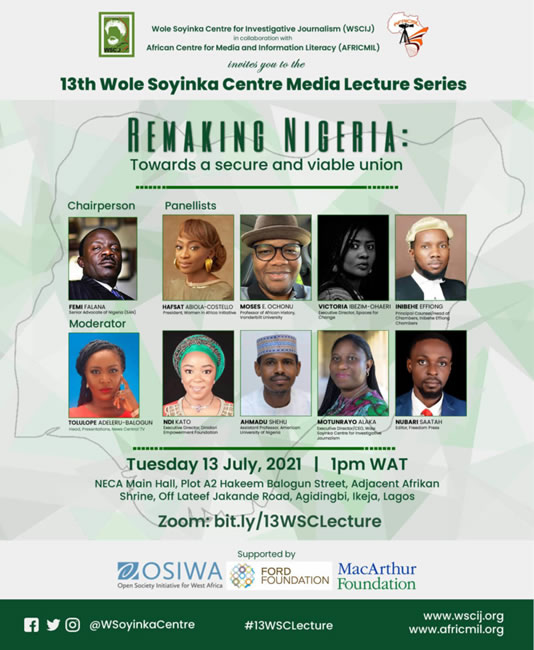 The 13th edition of the annual Wole Soyinka Centre Media Lecture held 13th July with the theme ‘Remaking Nigeria: Towards a secure and viable union in collaboration with the African Centre for Media and Information Literacy (AFRICMIL). The speakers – Inibehe Effiong, Principal Counsel/Head of chambers, Inibehe Effiong Chambers; Hafsat Abiola-Costello, President, Women in Africa Initiative; Moses Ochonu, Professor of African History, Vanderbilt University; Victoria Ibezim-Ohaeri, Executive Director, Spaces for Change; Nubari Saatah, Editor, Freedom Press; Ndi Kato, Executive Director, Dinidari Empowerment Foundation; Ahmadu Shehu, Assistant Professor, American University of Nigeria; and Motunrayo Alaka, Executive Director/CEO, Wole Soyinka Centre for Investigative Journalism – offered community-based education, diversification of the economy, vibrant and sustainable media, equity, justice and inclusion of women for remaking Nigeria.