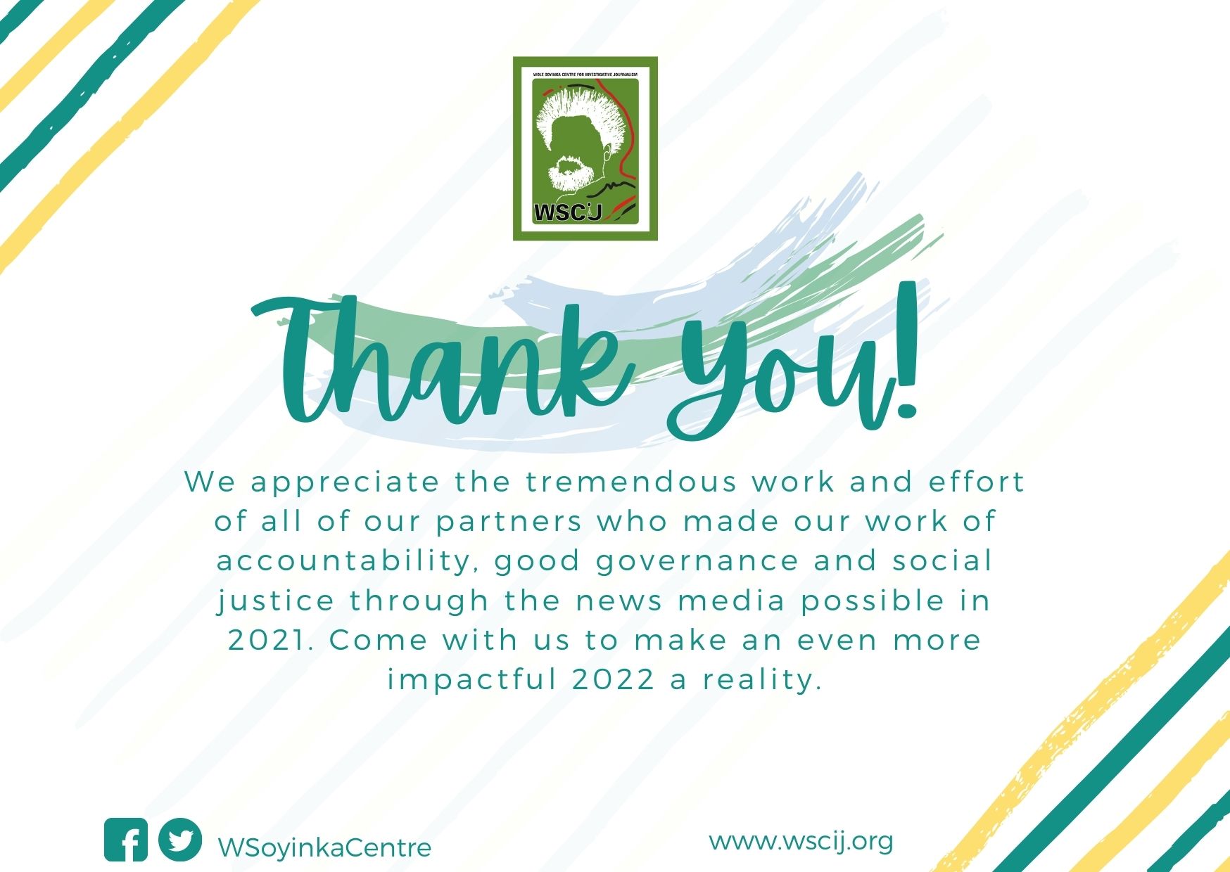 The Wole Soyinka Centre for Investigative Journalism (WSCIJ) had an incredible 2021. We accomplished an effective engagement of 52 stakeholders from 41 organisations, trained and mentored 74 reporters from 43 media organisations, engaged 63 resource persons from 54 organisations, honoured 14 reporters and two honorary award recipients from 15 organisations, held 24 media events across different projects, and enabled 81 stories through our various projects – REMOP, Report Women! Female Reporters Leadership Programme, Child Labour and Free to Share.