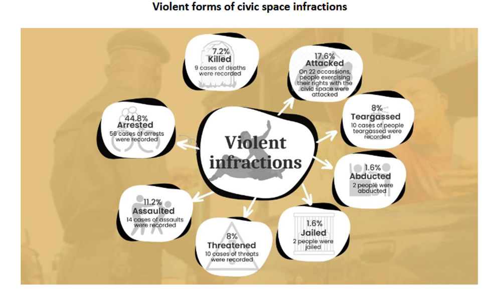 The exercise also sought to classify civic space infractions perpetrators (state and non-state actors), ascertain the victims/survivors of civic space infractions, determine the venues of civic space infractions and examine media reportage of civic space infractions (by genre).