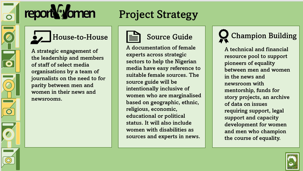 The Report Women! programme launched in 2014 was designed to address the dearth of news reports on issues of access and abuse affecting girls and women in Nigeria. Since inception it has raised champions for the cause of equality and engaged news media houses on the leadership of women in the news and newsrooms.