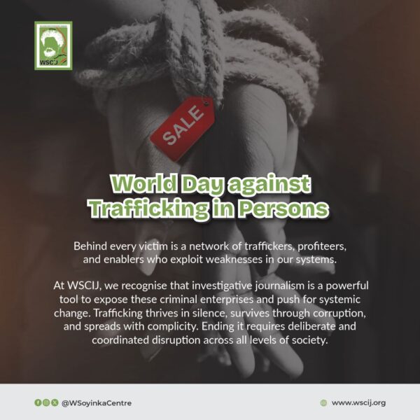 On this World Day Against Trafficking in Persons, the Wole Soyinka Centre for Investigative Journalism (WSCIJ) stands in solidarity with victims and survivors of human trafficking and calls for urgent, collective action against one of the most organised forms of modern-day slavery. As a Centre committed to exposing human rights violations through investigative journalism, WSCIJ recognises that uncovering the hidden networks that profit from exploitation is essential to ending impunity and advancing justice.
